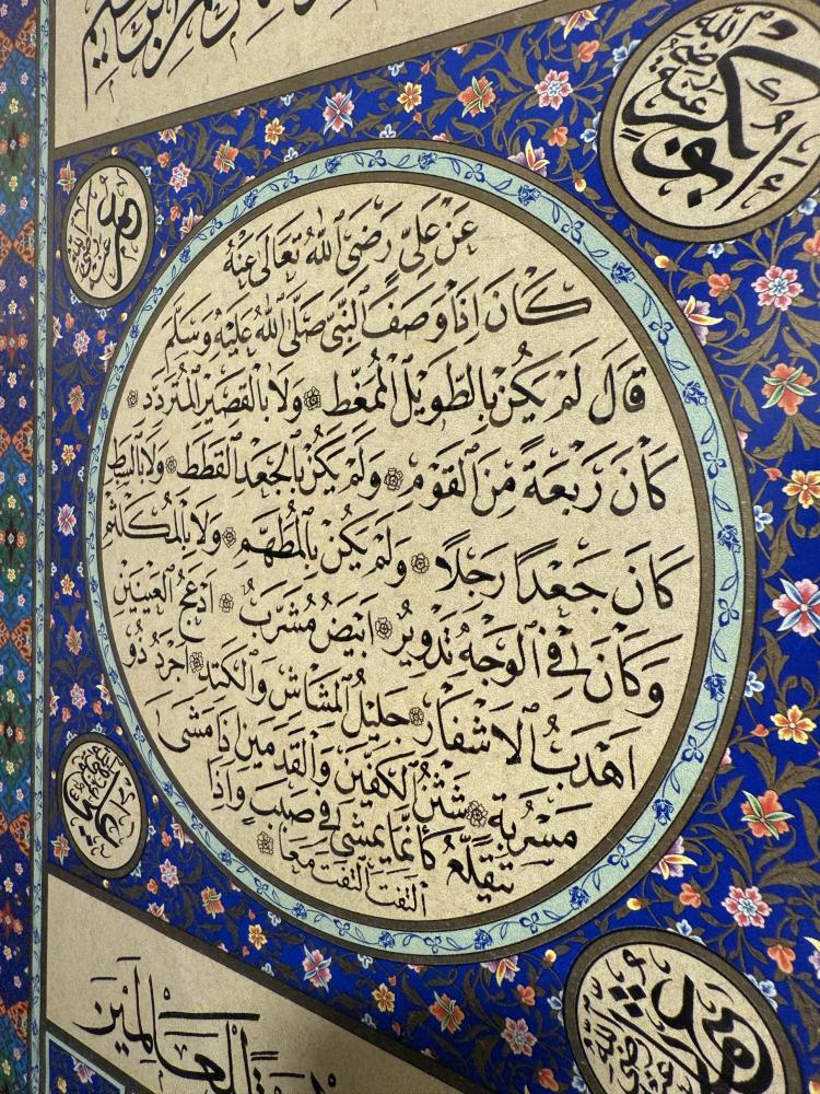 لوحة فنية فريدة كُتبت بخط اليد تجمع بين جلال المعنى وجمال الخط، تحاكي “الحِلية الشريفة” للنبي محمد ﷺ، كما نقلها العلماء، موصوفًا فيها خَلقه الشريف بأجمل الأوصاف.