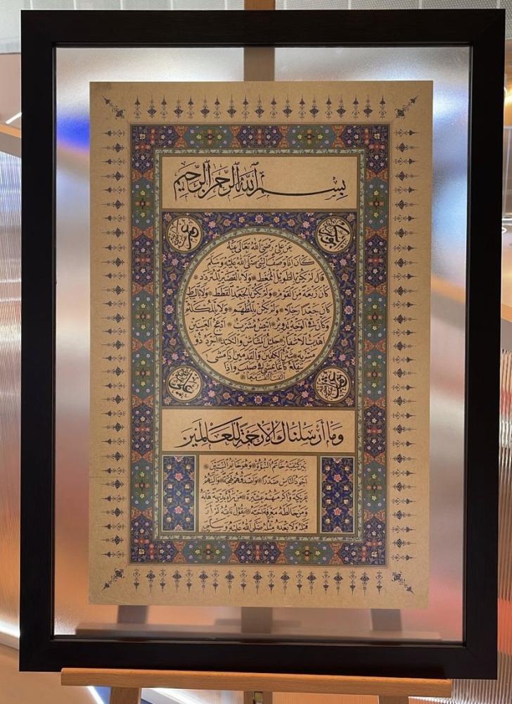 كُتبت بأنامل خطاط متقن، واختيرت فيها الأحبار والورق بعناية لتضفي على النص جمالية مميزة، ولتكون مصدر سكينة وتقدير في أي مجلس توضع فيه.